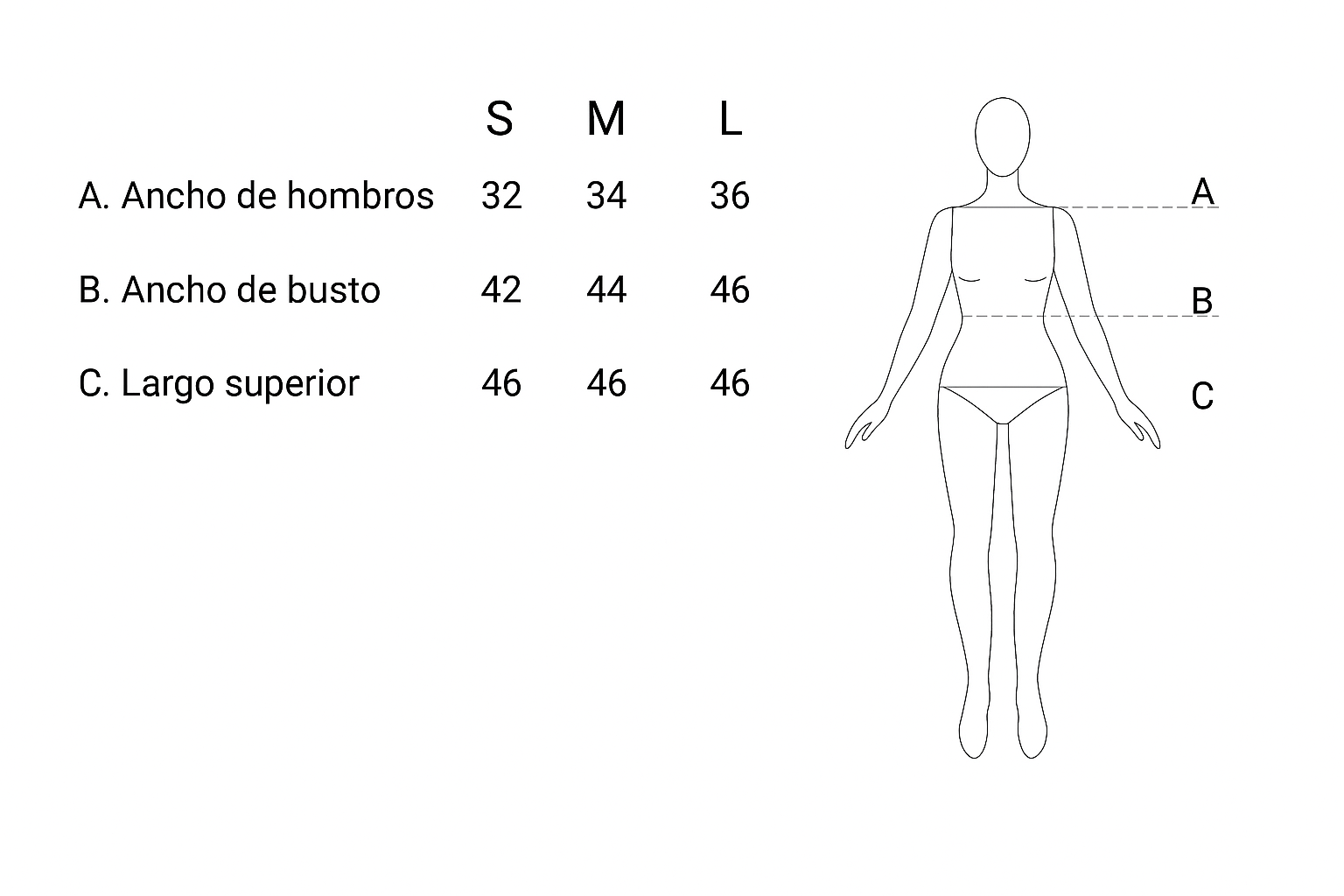 NOTAS: Cada prenda y modelo es único y diferente en sus medidas, de acuerdo al diseño de su molderia y estética. Las medidas se expresan en cm y son tomadas con la prenda sobre una superficie plana, sin estirar. Pueden tener pequeñas variaciones. Las prendas con elastico en la cintura, pueden ceder hasta 6cm aprox.